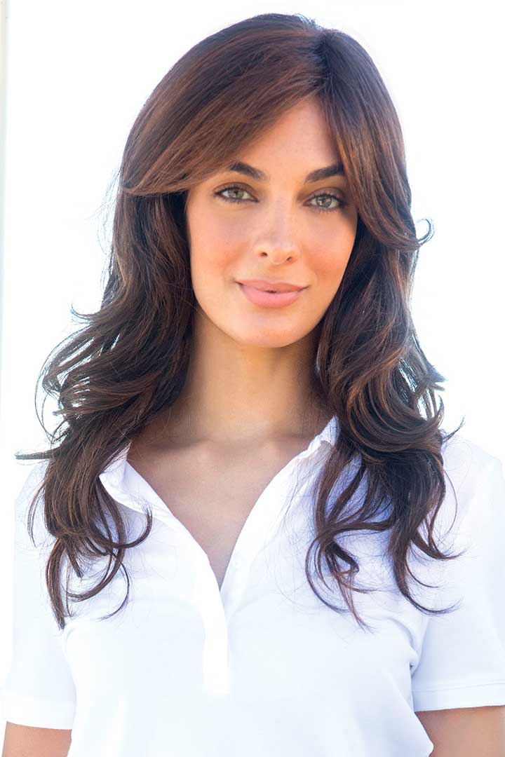 Peluca Brittany de cabello sintético: Capas largas y onduladas a media altura, con flequillo largo hacia un lateral.