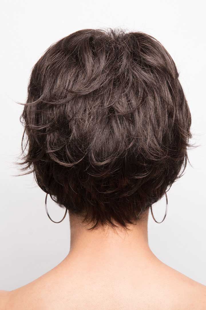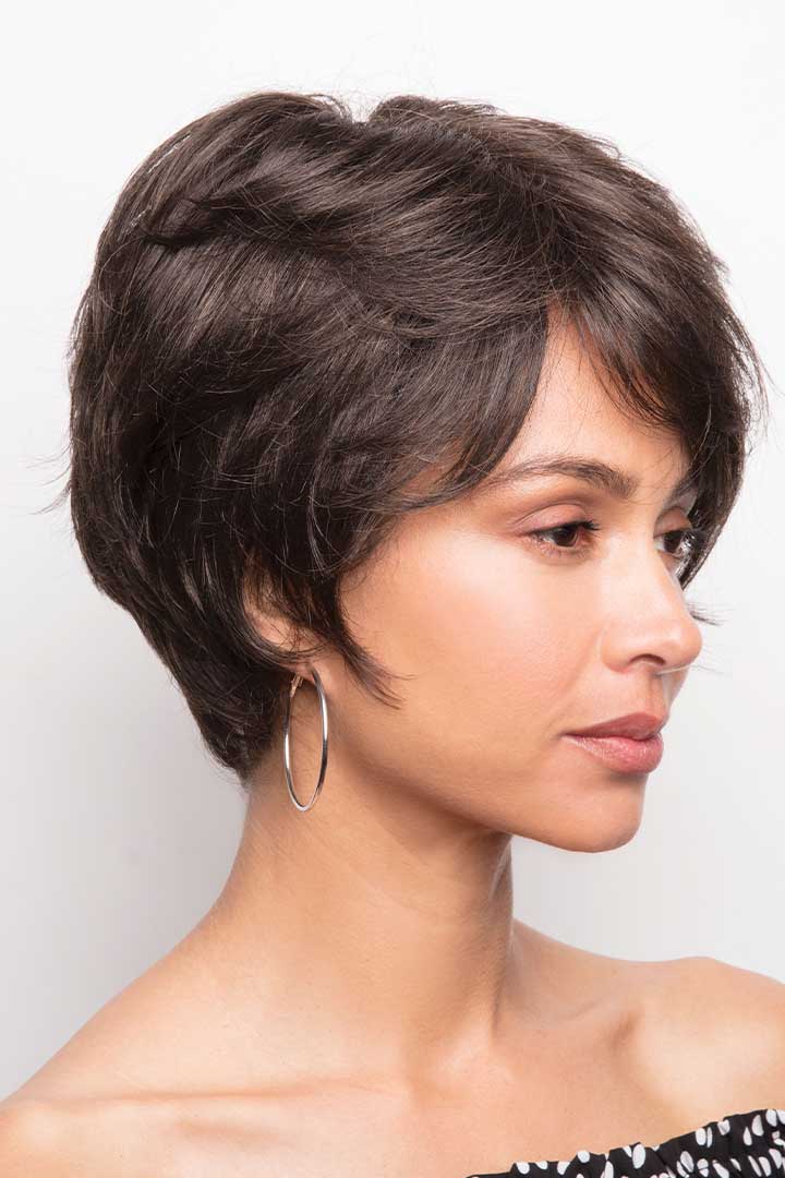Peluca Casey de cabello sintético: Estilo corto y ligeramente ondulado, que enmarca el rostro.