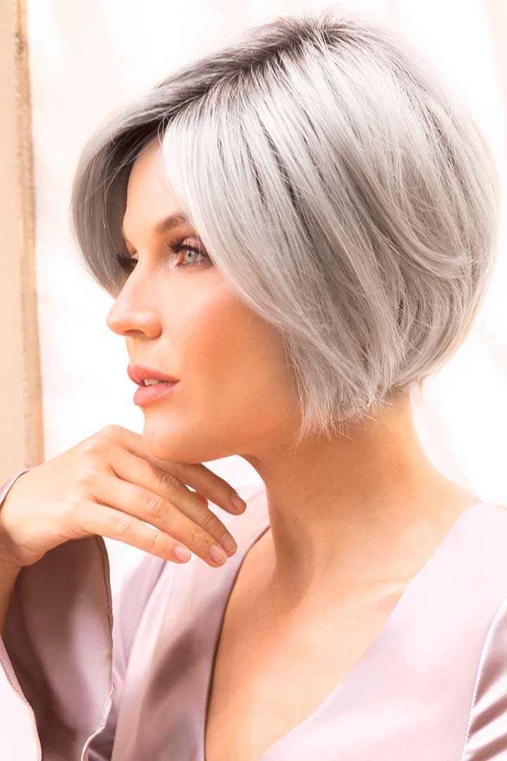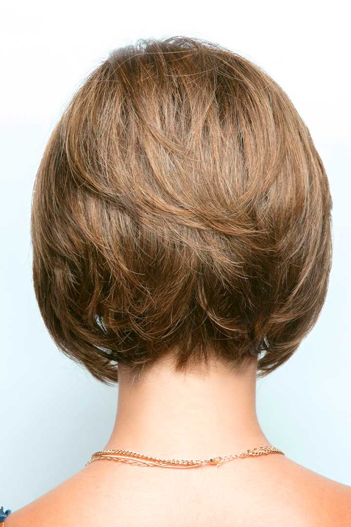 Peluca Emery de cabello sintético: Corte a capas, hasta la barbilla, con la nuca despejada y la raya en un lateral. Aporta un look atemporal y favorecedor.