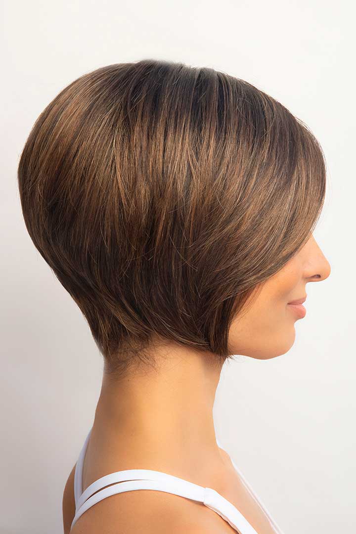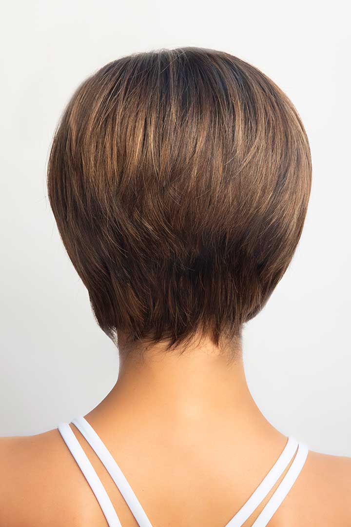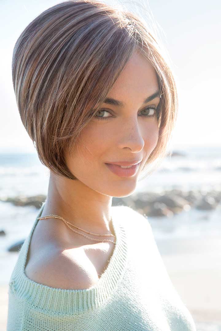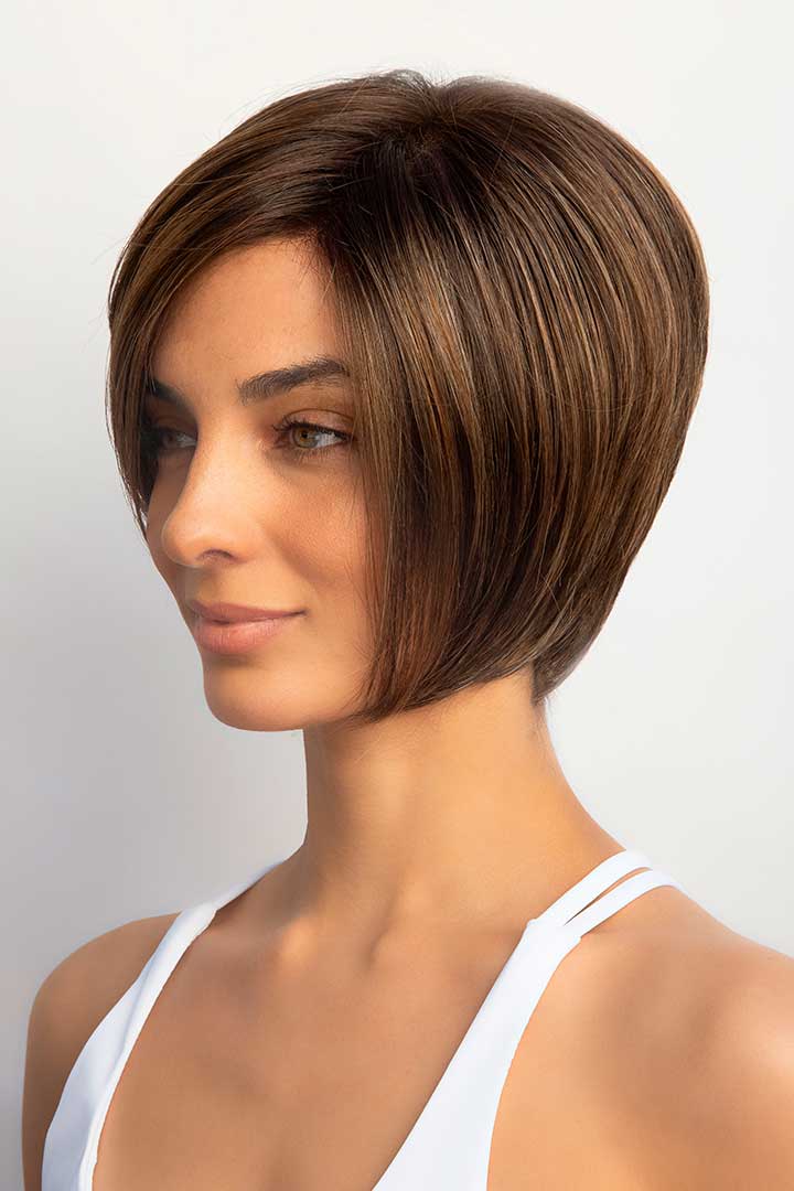 Peluca Emy de cabello sintético: Estilo versátil, liso y con raya lateral. Se le puede dar volumen en la parte superior para adaptarlo a cada estilo.