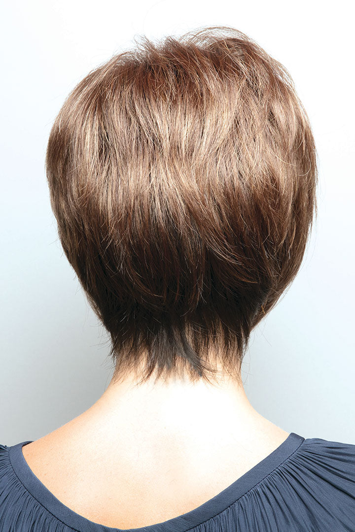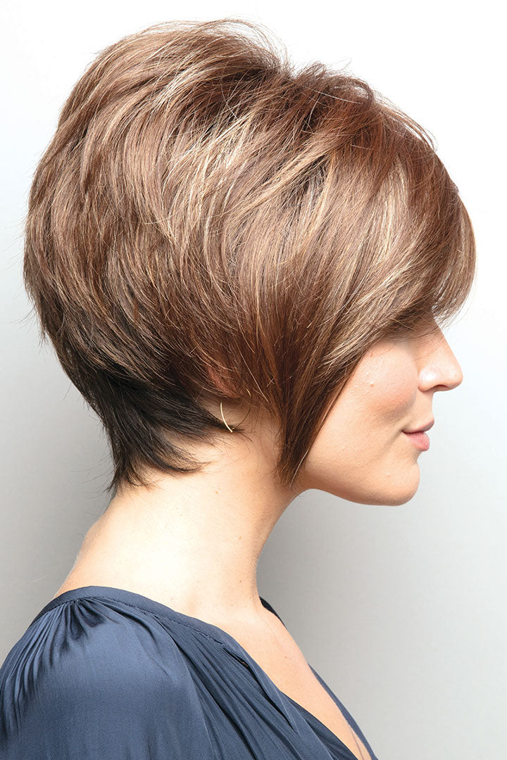 Peluca Kate de cabello sintético: Corte geométrico con flequillo lateral y volumen en la parte superior.