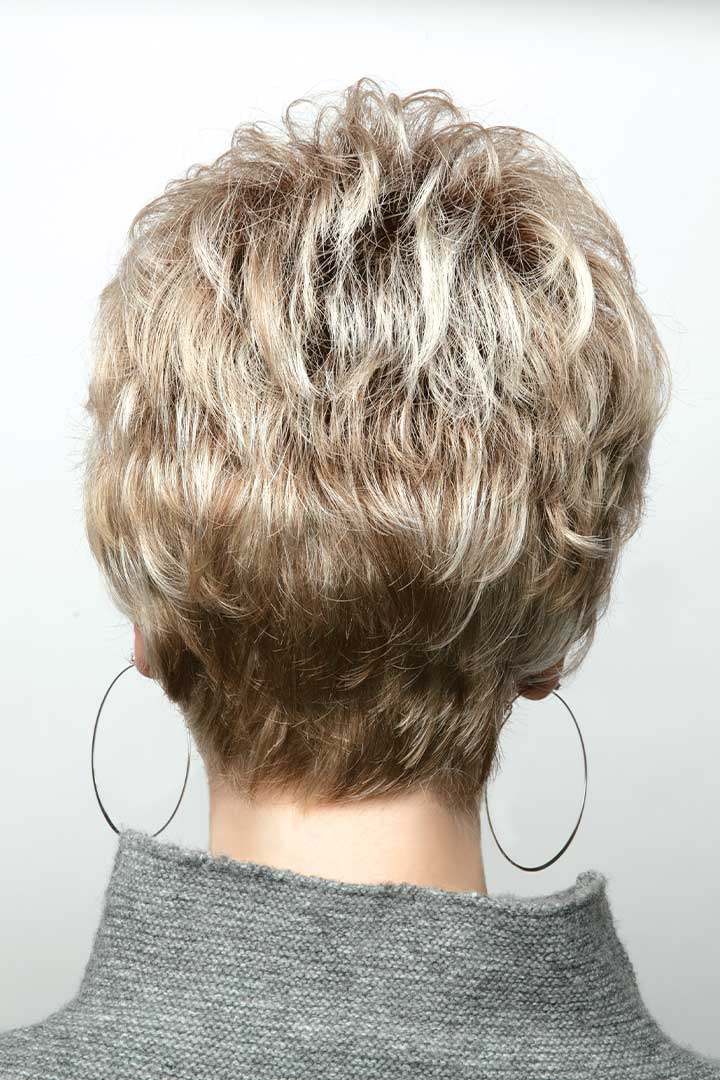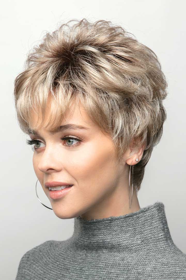 Peluca Rina de cabello sintético: Estilo corto, ondulado, con flequillo y con volumen en la parte superior.
