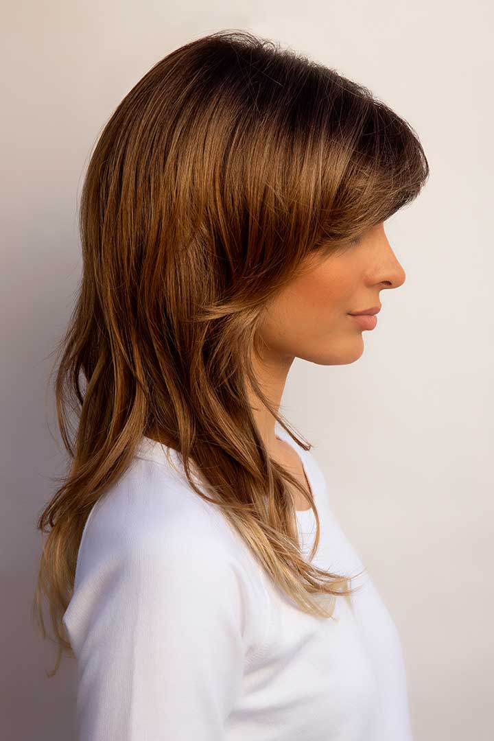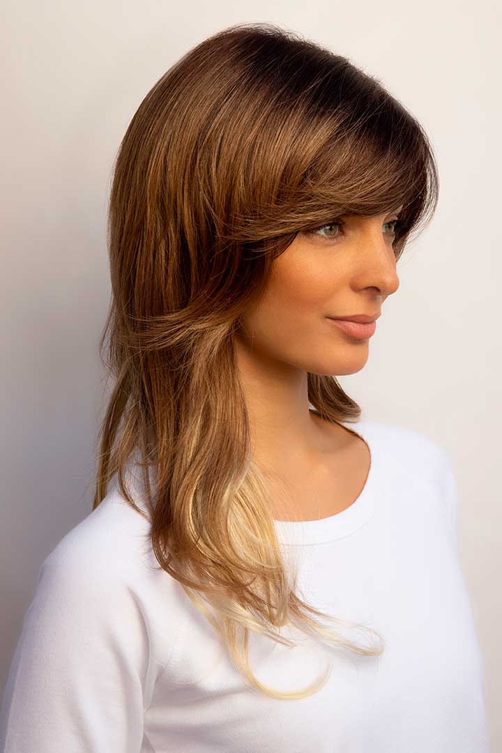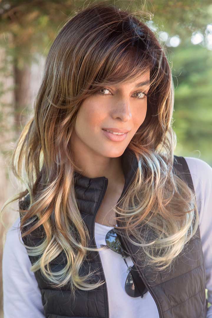 Peluca Royce de cabello sintético: Melena larga, con suaves ondas y flequillo hacia un lado, que permite peinarlo en diferentes estilos.