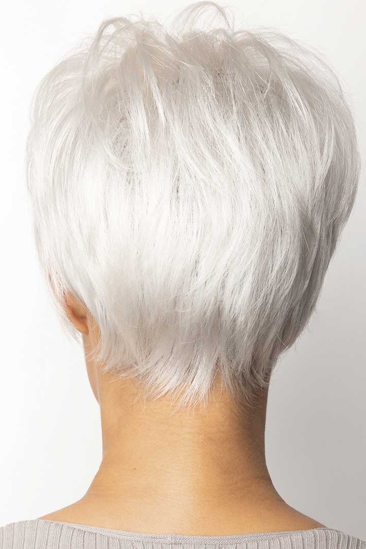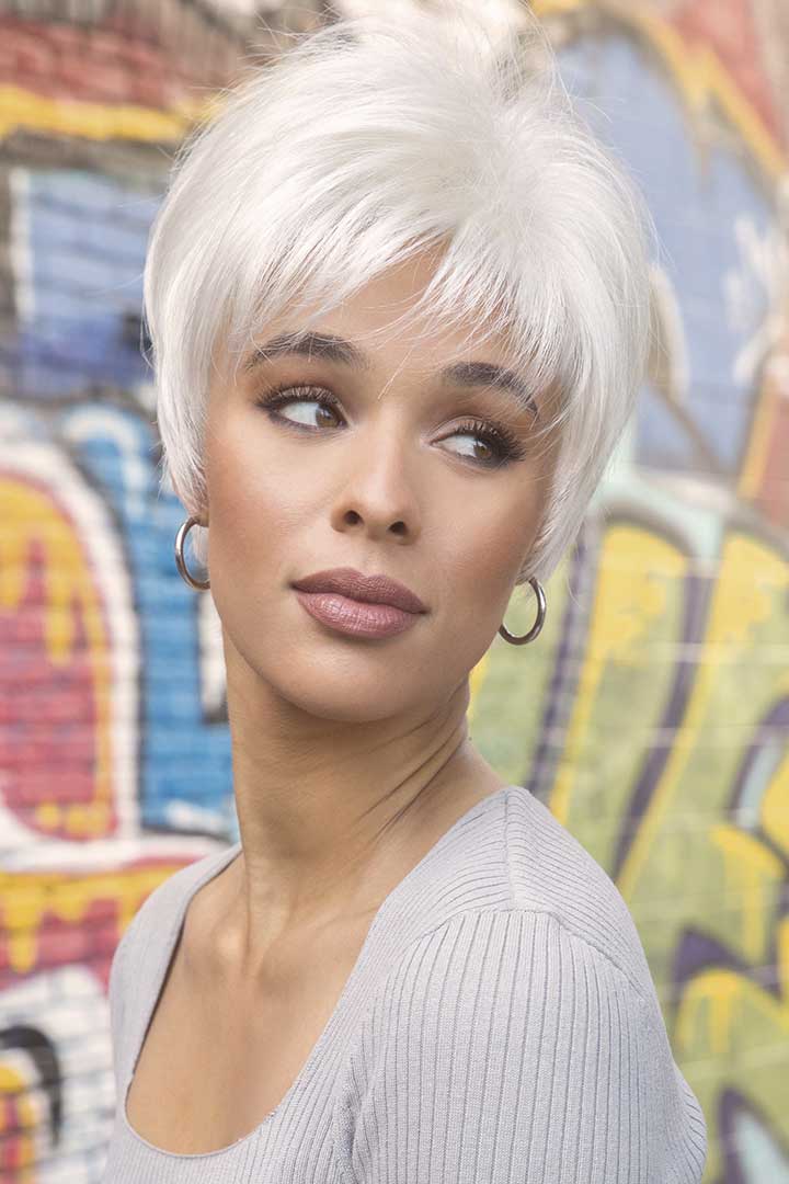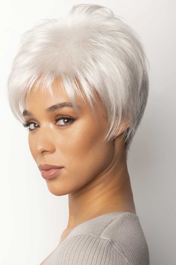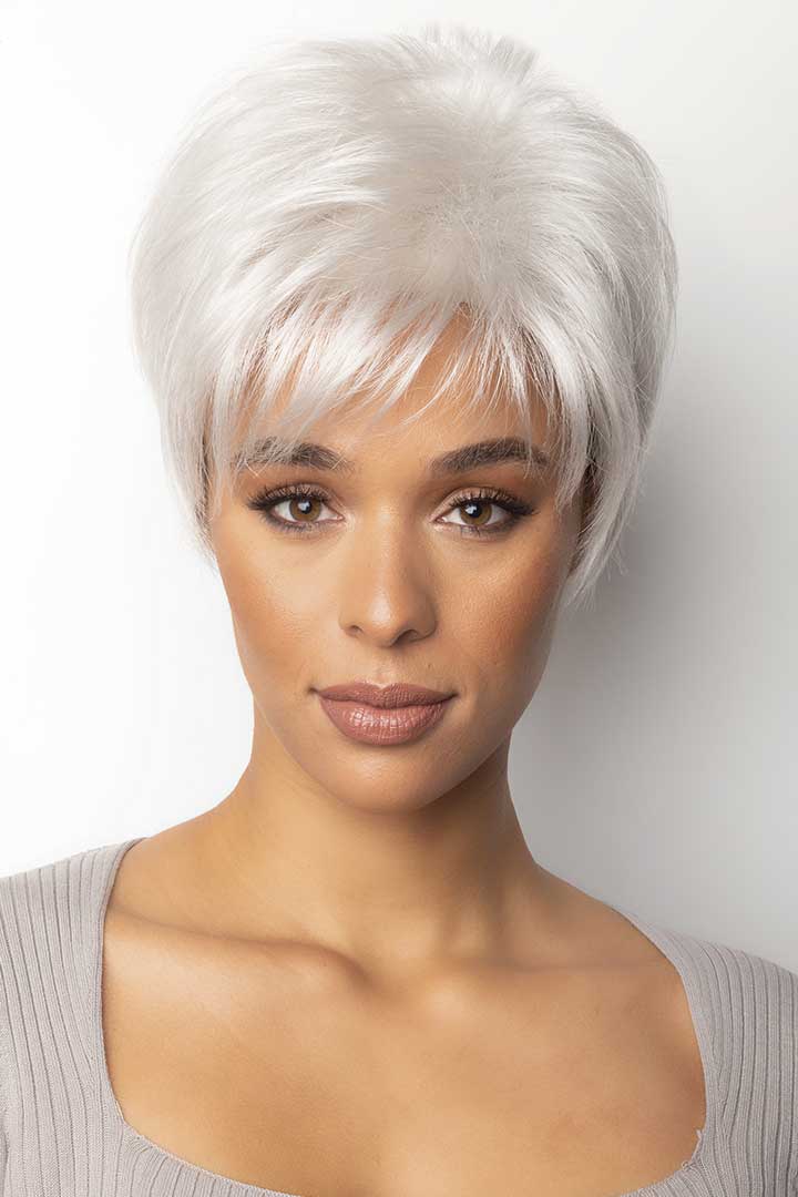 Peluca Samy de cabello sintético: Peinado corto y liso, con flequillo y la nuca despejada.
